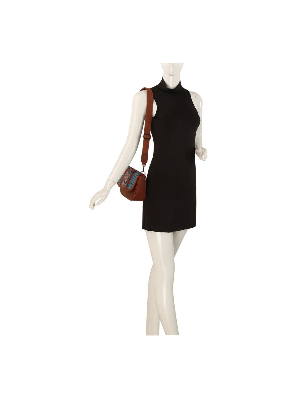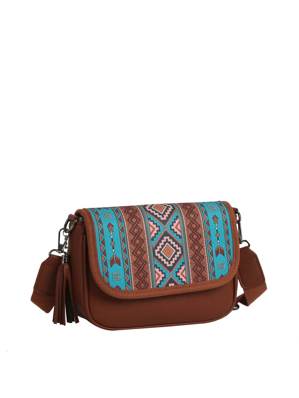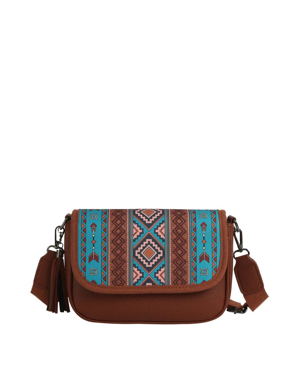 * Southwestern-inspired tribal pattern with vibrant geometric design * Includes matching coin pouch for added convenience * Faux leather body with tassel zipper pull for a stylish touch * Adjustable crossbody strap for comfortable, hands-free wear Approximate size: 5.9 x 2.7 x 8.8