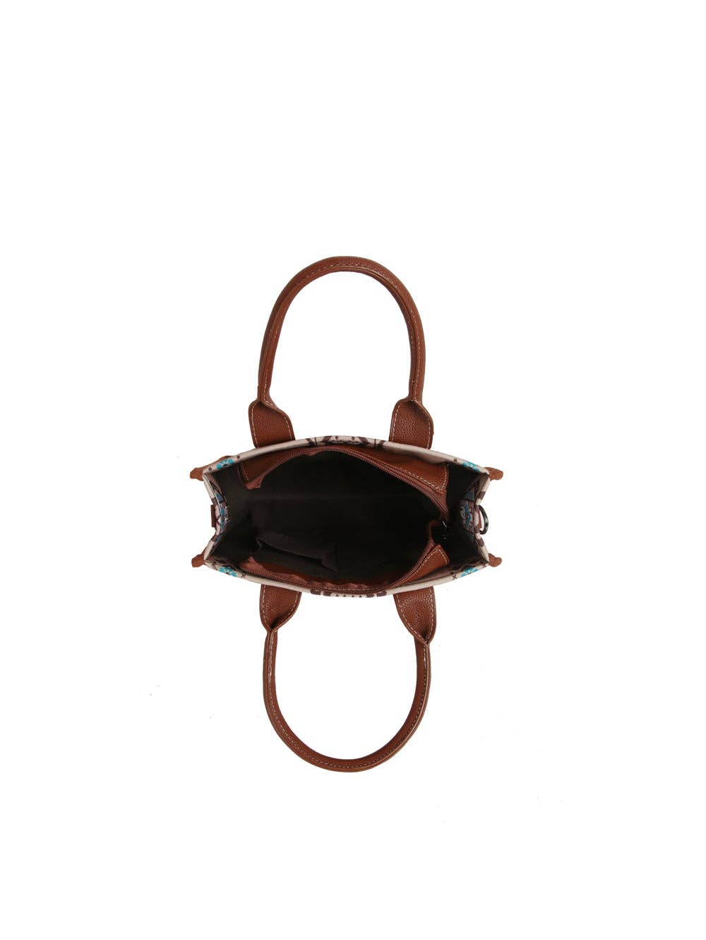 * Western Aztec-inspired print with colorful geometric motifs * Includes matching zip pouch and detachable * Faux leather handles with woven whipstitch and fringe details * Structured silhouette with roomy interior and inner pockets for essentials Approximate size: 8.6 x 4.5 x 10.6