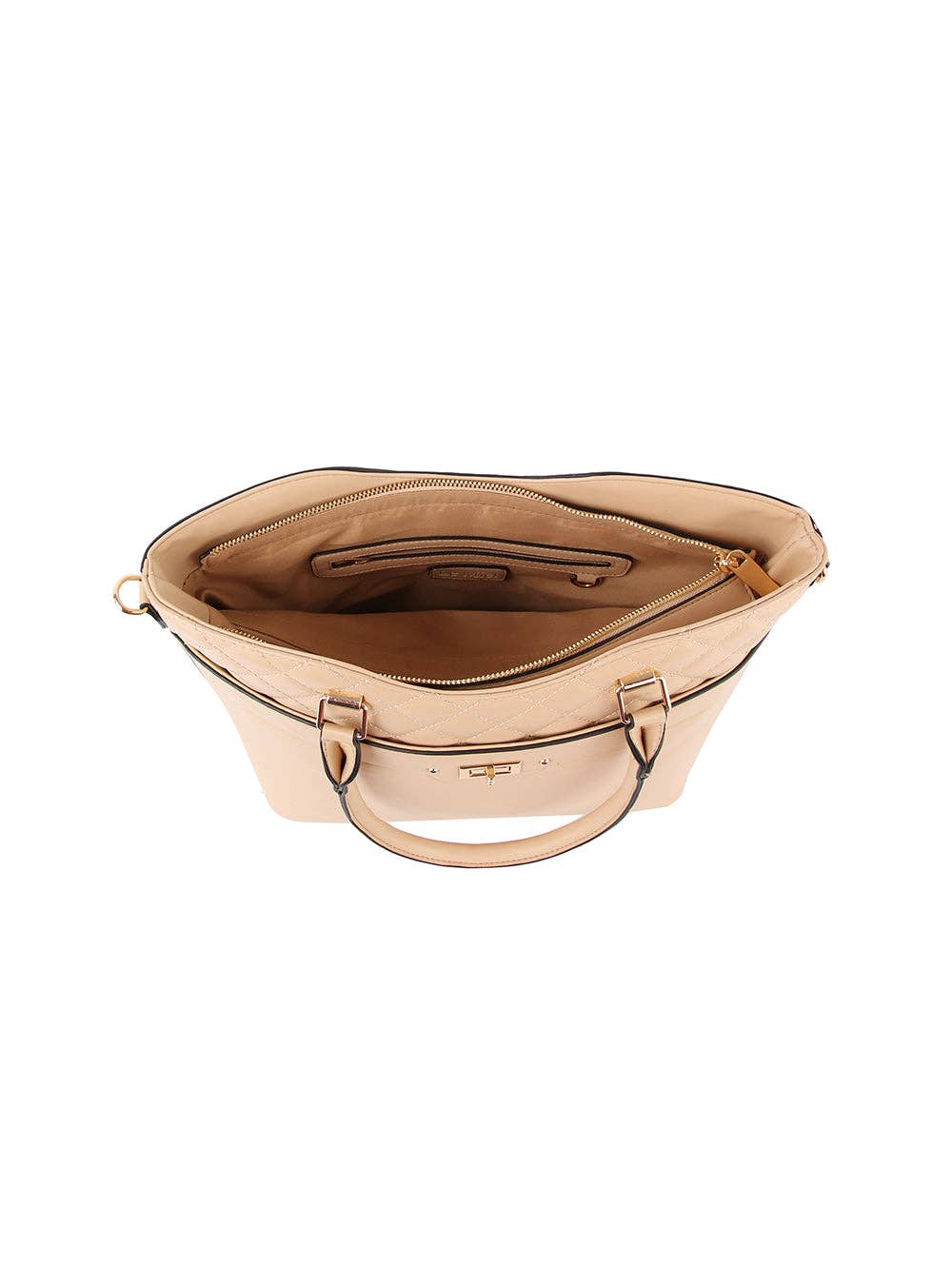 •A pragmatic yet statement-making accessory, our Malaya Tote is an instant icon. Crafted from luxe Saffiano vegan leather, and designed with gold-tone embellishments, this tote is an enduring classic you will reach for season after season, sized to fit just the essentials. Defined by a structured silhouette and a bar closure, which folds over the top handle and also a top zippered to keep the bag securely closure. Open the top zipper closure to reveal a fully lined well-organized interior with two slip pockets and a wall zippered pocket. Wear it in your hand by the top handle, or attach the shoulder adjustable strap and carry it crossbody for hands-free ease. This style has a flat base and feet for stability. You will love our Malaya Tote. •POCKETS: Interior features a wall zip pocket and two slip pockets. •Measurements: 10.25” W x 7.8” H x 5.5” D •Removable and Adjustable strap: Extends to 25”