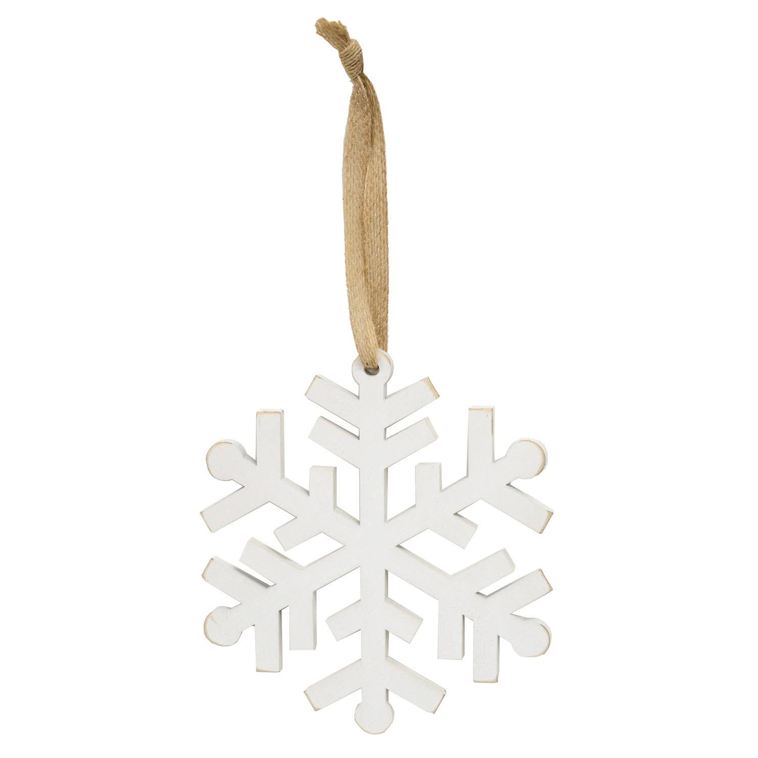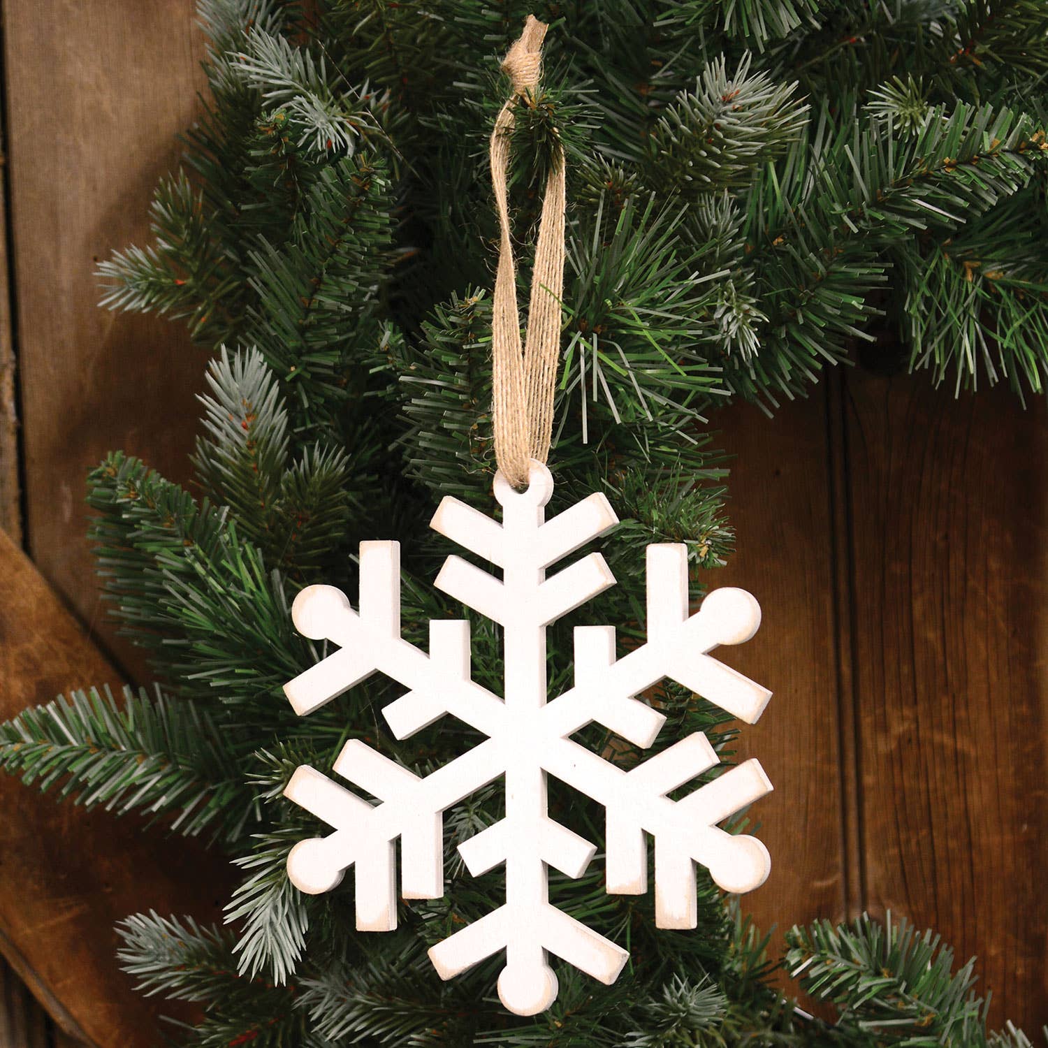 A lightly weathered wooden snowflake ornament is essential for Winter farmhouse decorating. The burlap hanger adds a rustic charm to your displays. This oversized ornament measures 6" across and isn't only for Christmas trees; hang in the center of a wreath, in a window, or adorn a basket of cozy throw blankets.