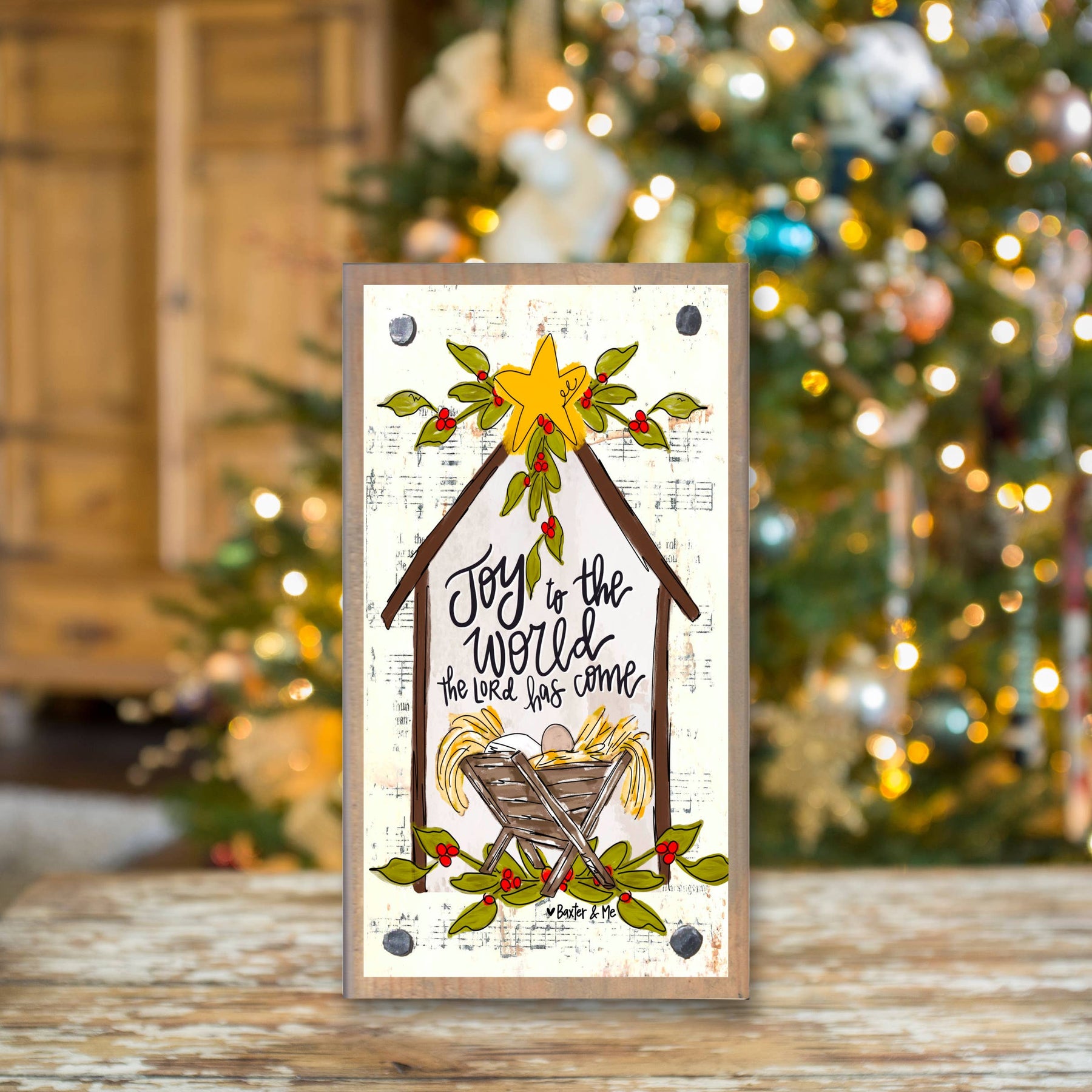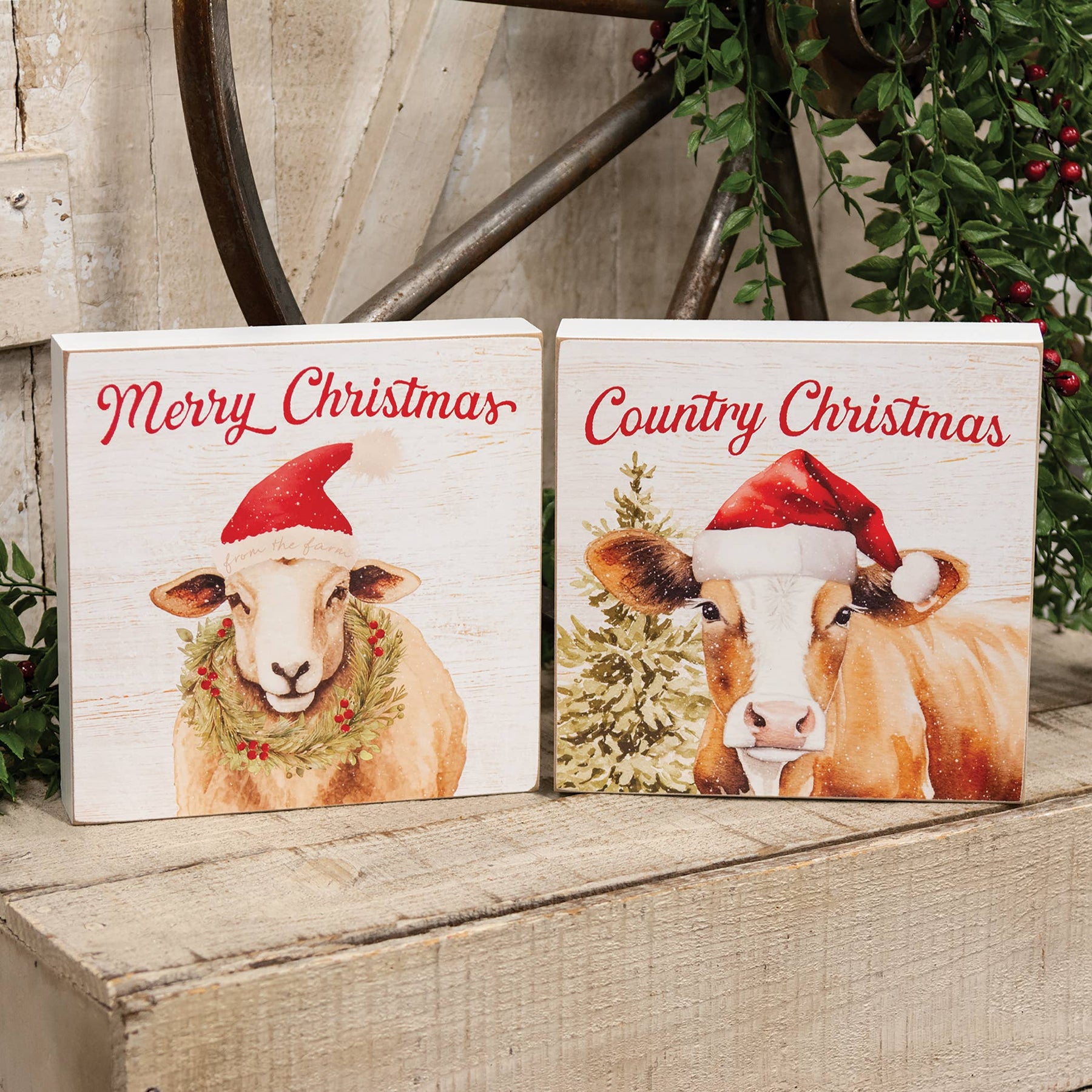 On the Farm Box Signs bring a unique accent to shelf or tabletop Christmas decor. Crafted from wood, each sign features a white painted distressed finish and watercolor depiction of a friendly farm animal. A brown and white cow wearing a Santa hat and standing by an evergreen tree adorns one sign, along with red script text that reads “country Christmas.” A light tan sheep wearing a holly wreath and a Santa hat adorns the other sign, with red script text that reads “merry Christmas.” Each measures 8” high by 8” wide by 1.5” deep. Please note: This item features a variety of designs which are priced individually (not as a set). When you order the case quantity of 4, you will receive 2 of each style when available.