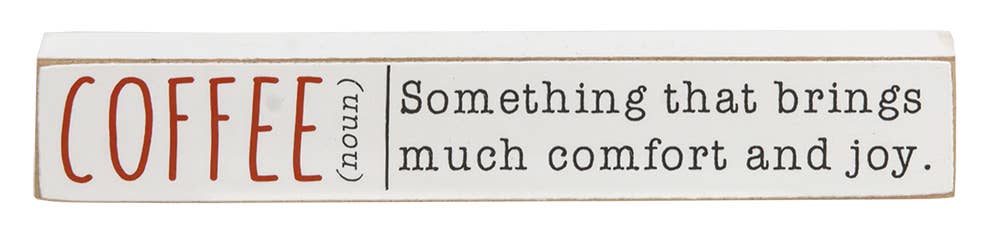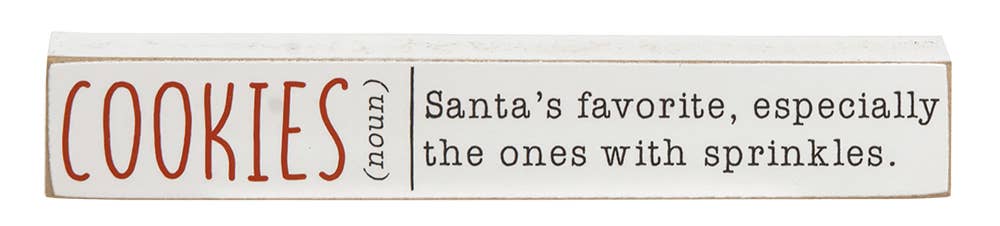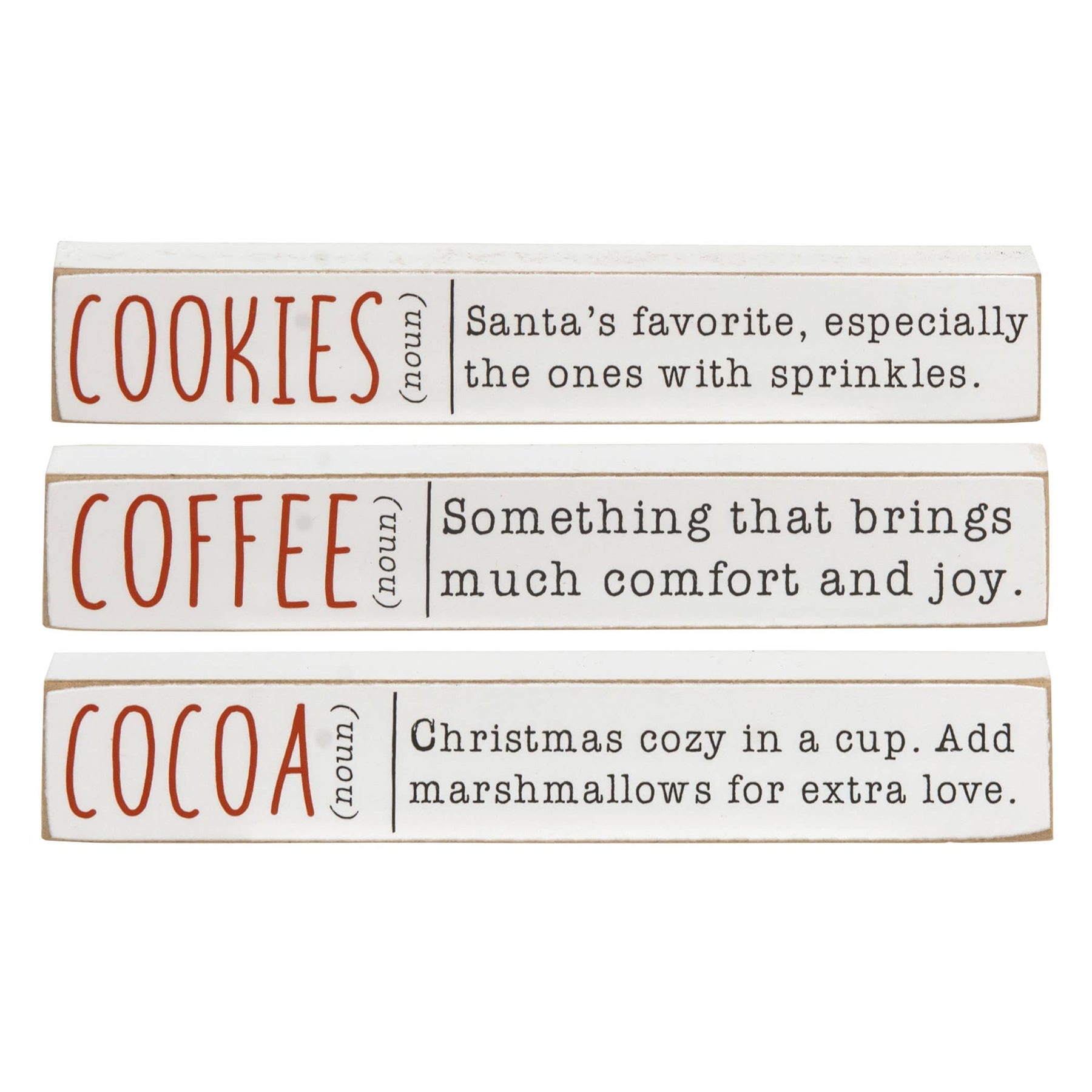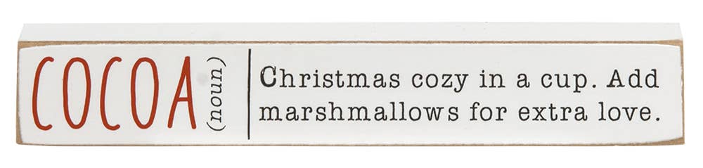 Cocoa Cookies Coffee Mini Stick is made of wood and features a white finish with distressed edges and it reads, "Coffee (noun): something that brings much comfort and joy," "Cookies (noun): Santa's favorite, especially the ones with sprinkles," or, "Cocoa (noun) Christmas cozy in a cup. Add marshmallows for extra love" in red and black text. Measures 1" high by 6" wide by .5" deep.