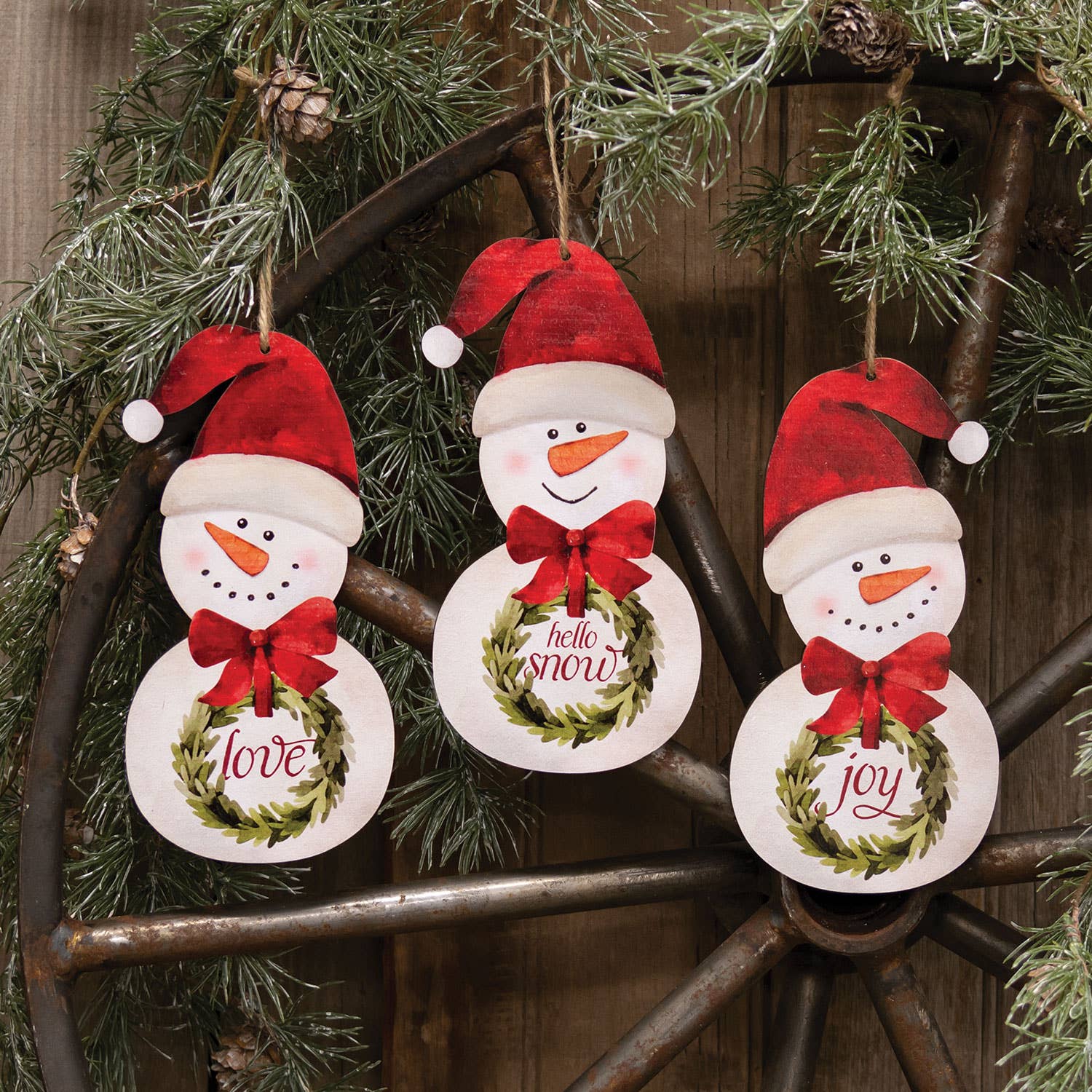 These Snowman Ornaments are cutout snowman ornaments made of distressed wood. The snowmen are painted ivory with smiling faces and orange carrot noses. Each snowman features a winter accessory, one a red striped scarf, another a Santa hat, and the third a black top hat. Display these snowmen hanging on a Christmas tree or other space in the home, using the attached jute loops, for a rustic addition to the home during the holiday season. Each ornament measures 5” high by 3.5-4” wide.