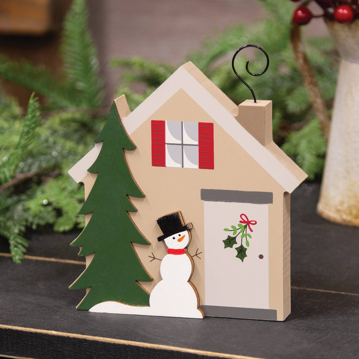 Our Snowman & Pine Tree Chunky Winter House Sitter adds winter charm to any shelf, mantel, or side table. It has layered wood accents for added dimension and hand-painted details, plus a curl of wire emerges from the chimney for a cozy touch. This freestanding seasonal piece measures 6" high by 5.5" wide by 1" deep.