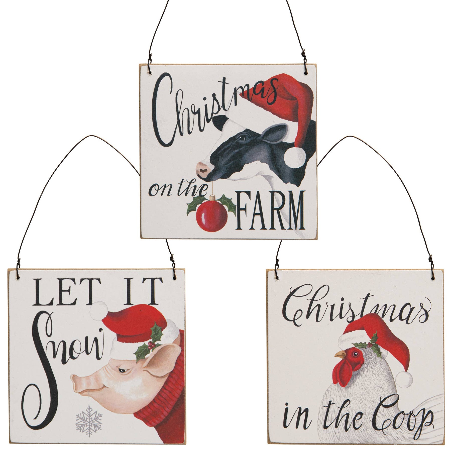 Farm Square Ornament has a square shape with a white print and it comes ready to hang by a metal wire. It reads, "Christmas in the coop" in black text with a Christmas rooster graphic; "let it snow" in black text with a Christmas pig graphic; or, "Christmas on the Farm" in black text with a Christmas cow graphic. Measures 3.5" high by 3.5" wide by .25" deep.