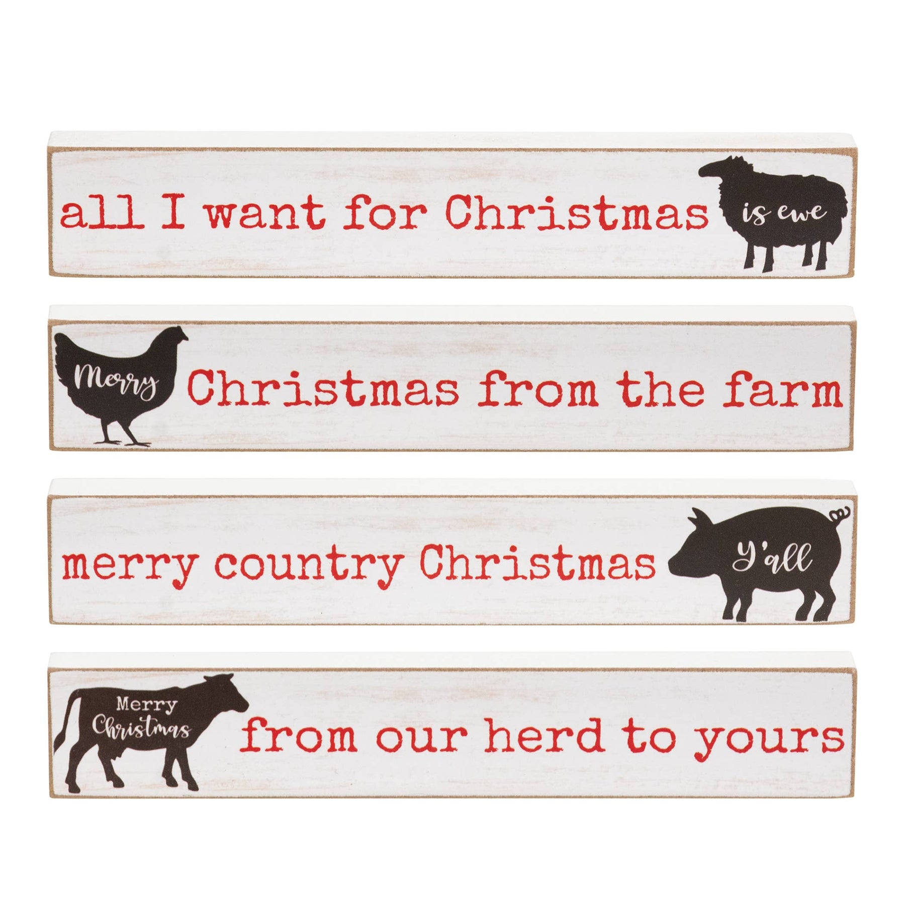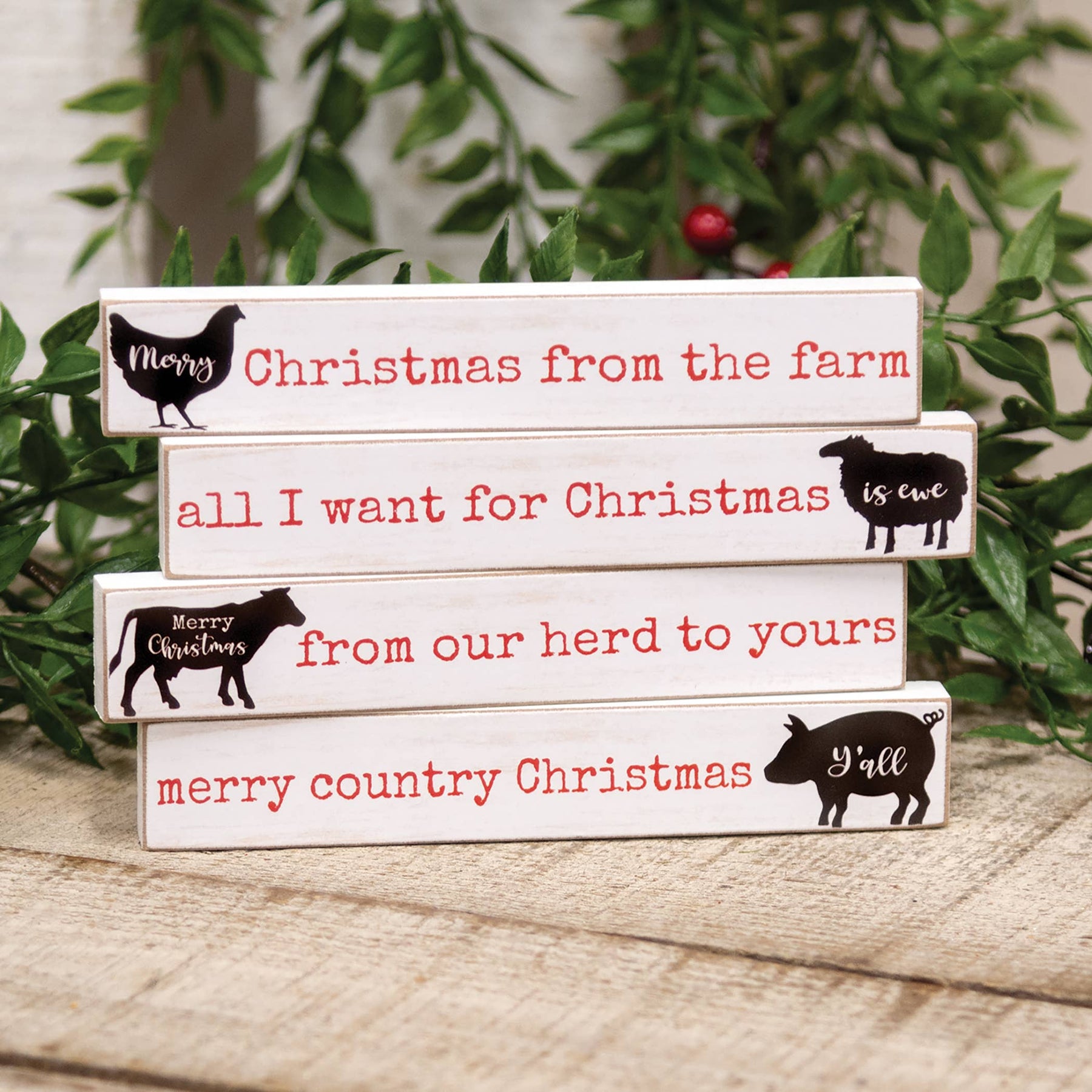 From Our Herd to Yours Mini Sticks bring a farmhouse-friendly touch to holiday decor. The wooden blocks each feature a whitewashed wood stain with distressed edges. Each block features the silhouette depiction of a farm animal along with red print and white script fonts. One block features a pig and reads, "merry country Christmas y'all." One shows a cow and reads "merry Christmas from our herd to yours." One block features a sheep and says "all I want for Christmas is ewe." One shows a chicken and says "merry Christmas from the farm." The blocks are freestanding for stable display on a flat surface. Each measures 1" high by 6" wide by .5" deep