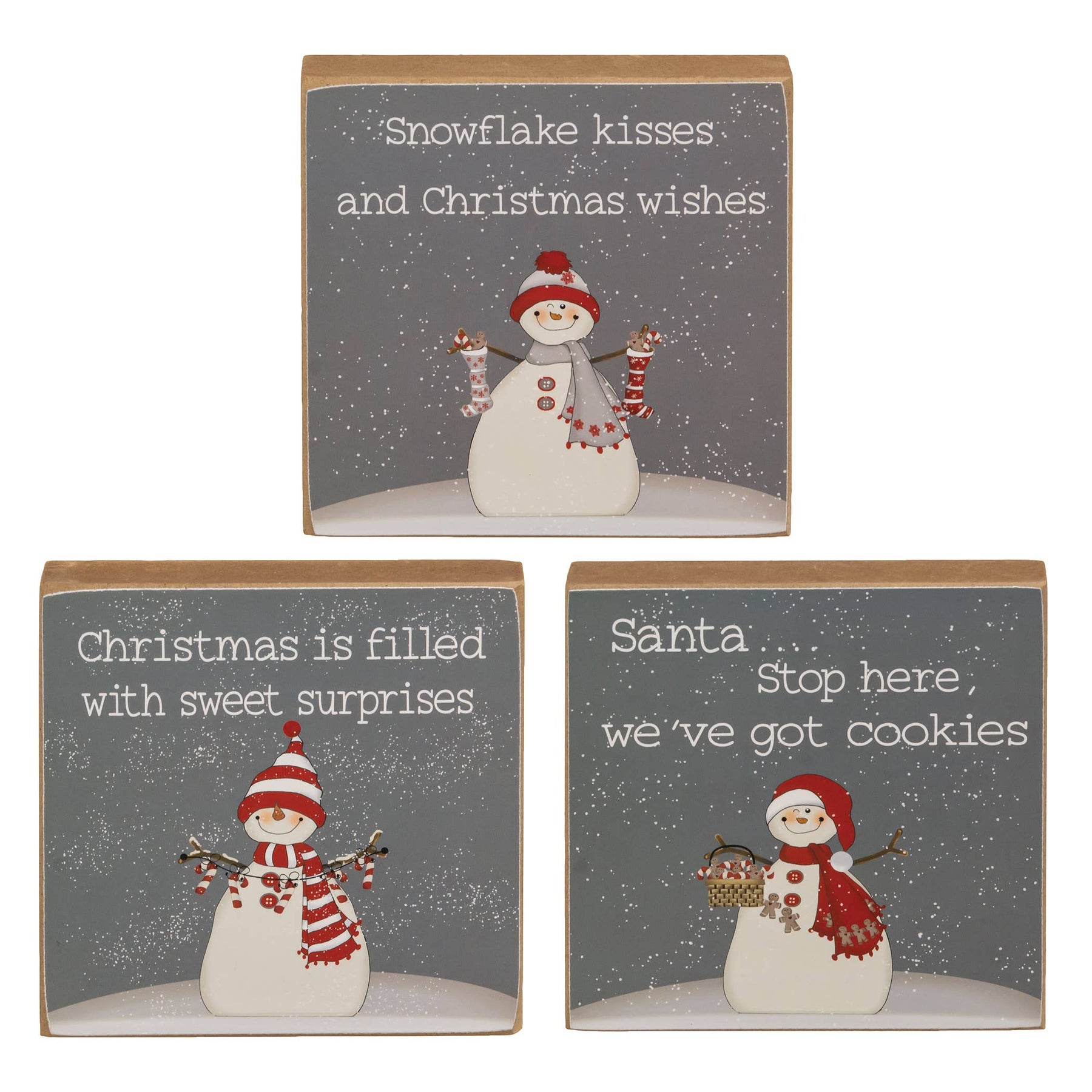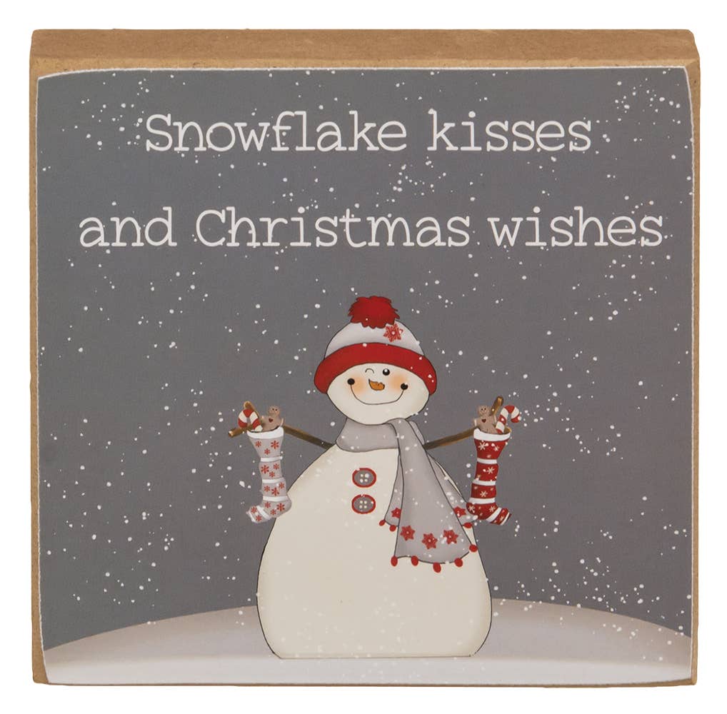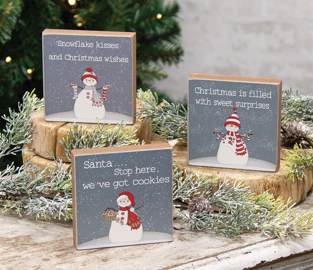 Cookies Square Block reads, "snowflake kisses and Christmas wishes," "Santa...stop here, we've got cookies," or, "Christmas is filled with sweet surprises" in white text with a winter snowman graphic and it has unpainted sides for a rustic touch. Measures 4" high by 4" wide by .75" deep.