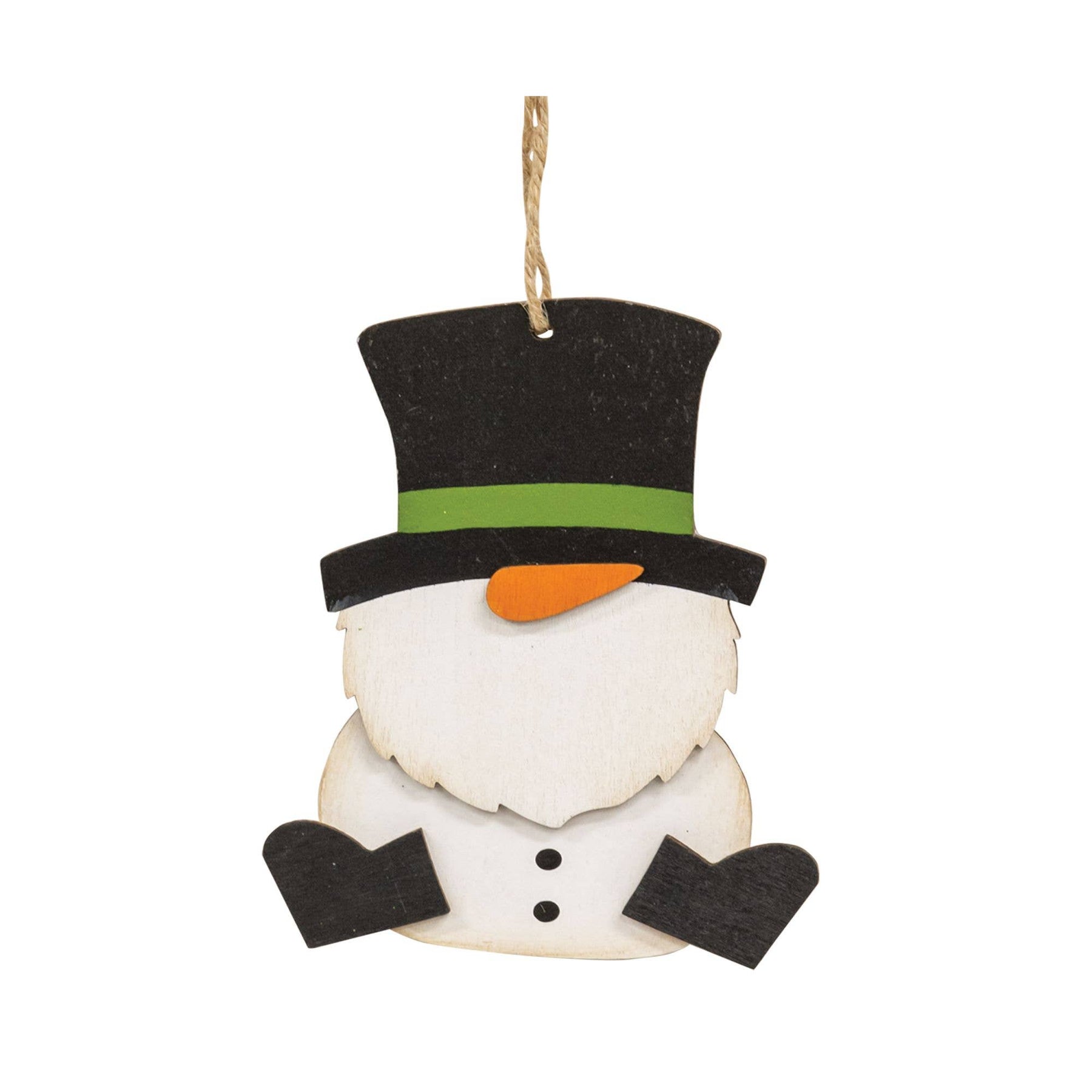 Our Wooden Snowman Gnome Ornament has a painted top hat and a carrot nose and boots as dimensional accents. Measures 4.75" high by 3.25" wide and has a jute twine hanger. Will look great on a Christmas tree, as well as on a knob or hook to add winter charm in any room.