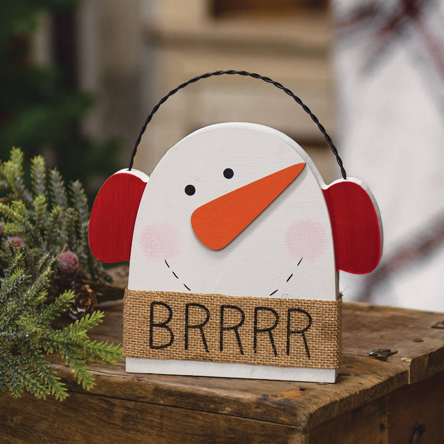 Our Brrrr Snowman is a wooden sitter that has twisted black wire attached to his earmuffs. He's painted white with red earmuffs and a dimensional orange nose. A strip of burlap is wrapped around the bottom with the word "Brrrr" written in black. Brrrr Snowman will add fun and whimsy to any winter decor.