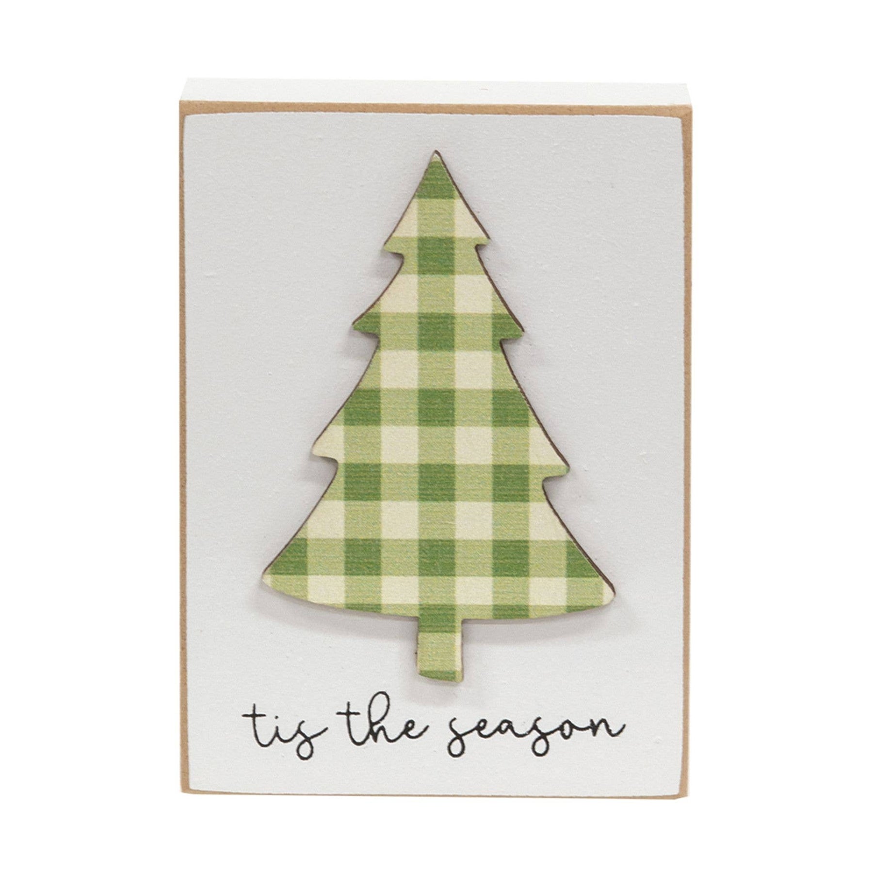 The Tis the Season Plaid Tree Block is a decorative wooden Christmastime block with a white painted finish and natural worn edges. The block reads “tis the season” in simple black script and features a wooden evergreen tree cutout with a green and cream gingham pattern. This block makes a wonderful addition to a riser, shelf, or tabletop space, bringing a simple and festive touch to the home during Christmas. Measures 4” high by 3” wide by .75” deep.